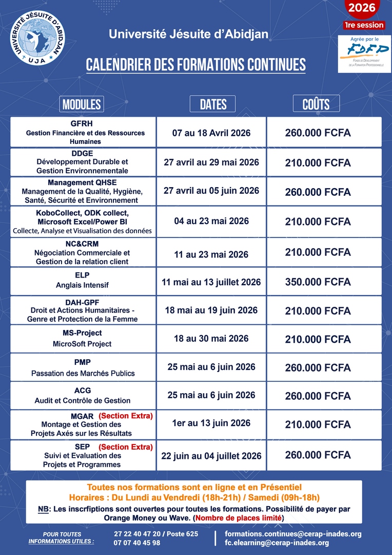 L'Université Jésuite d'Abidjan, en plus des formations diplômantes, propose une large gamme de formations continues "clés en main", reconnues et habilitées par le FDFP (Fonds de Développement de la Formation Professionnelle).