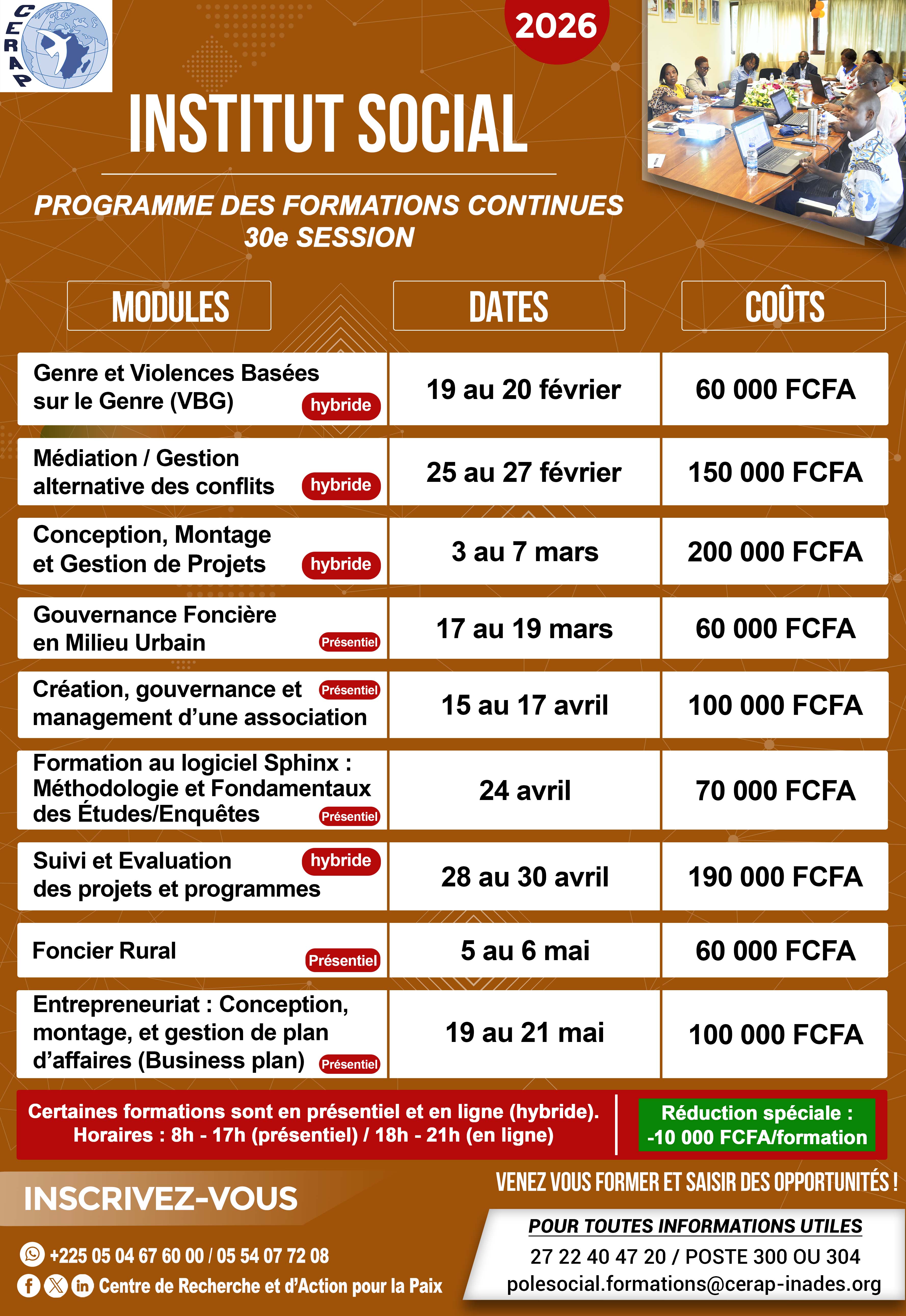 L'Institut social du CERAP (Service projets et ASMU) propose plusieurs modules de formation pour le renforcement des capacités des Organisations de la Société Civile (OSC), bénévoles, volontaires, salariés, professionnels et leaders du secteur associatif (ONG, projets, etc.).