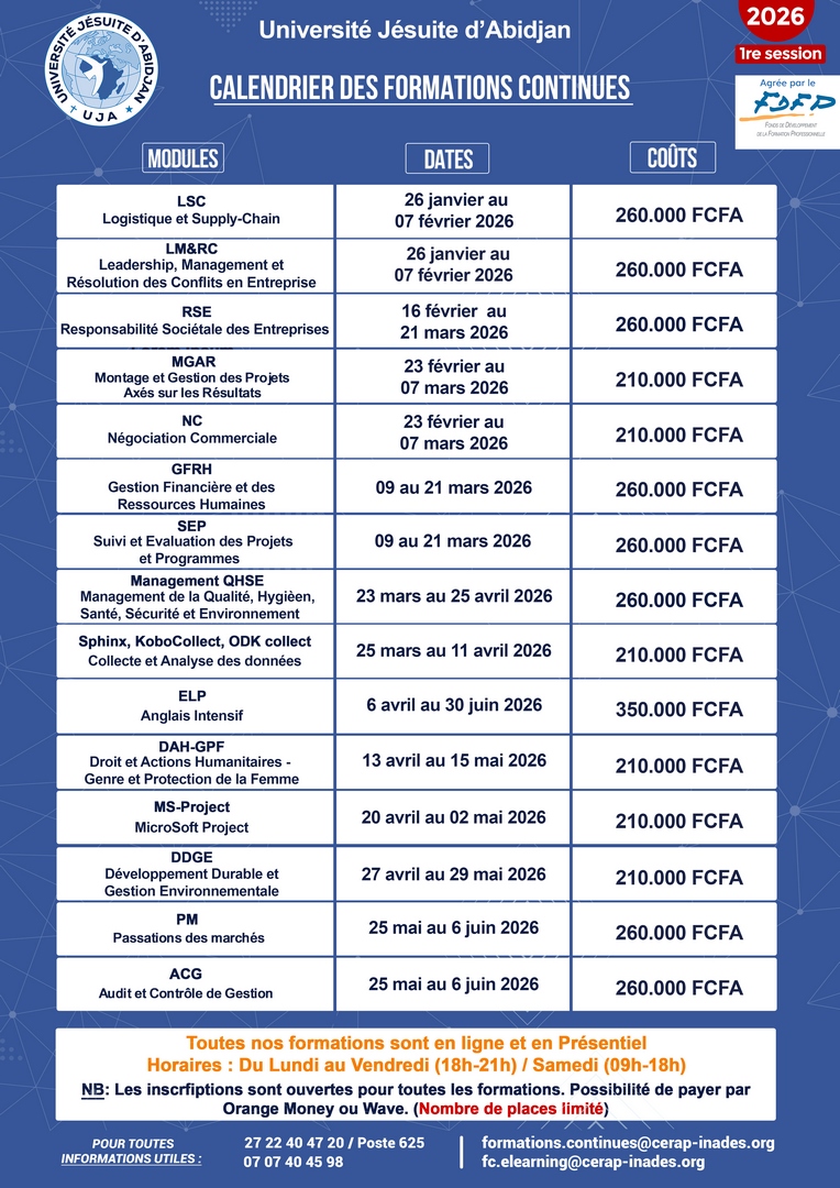 L'Université Jésuite d'Abidjan, en plus des formations diplômantes, propose une large gamme de formations continues "clés en main", reconnues et habilitées par le FDFP (Fonds de Développement de la Formation Professionnelle).